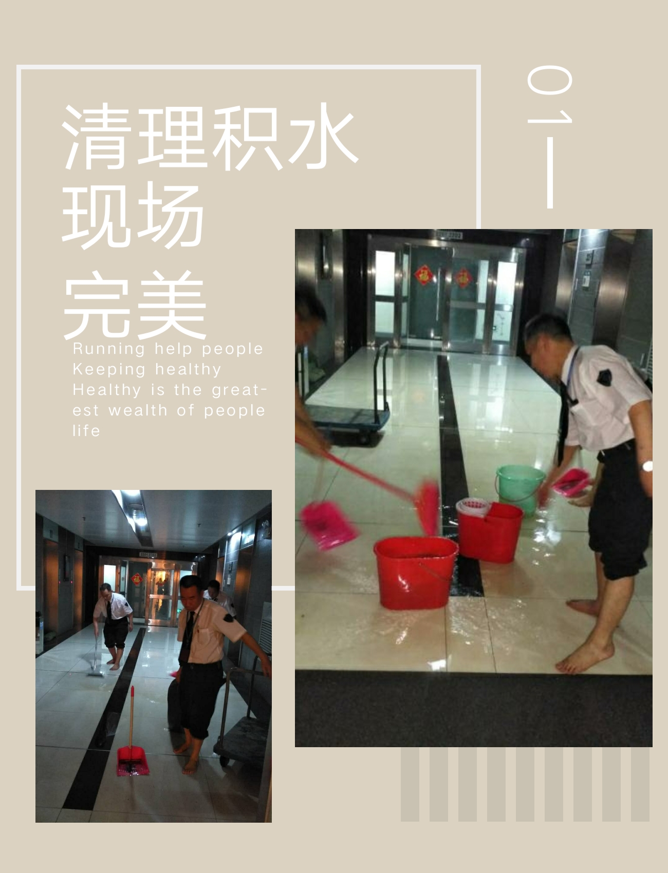 接到通知后队员贾玉新,王周辰,唐河青拿来撮箕,水桶,沙袋立马投入抢险,尽一切力量控制现场,防止水浸范围扩散。工程部人员及业主赶到后,立即关闭本层空调阀门,打开地漏,排除积水,整个抢险过程有条不紊地进行着,大伙打着赤脚,敏捷而迅速,连续作战一个多小时,将积水扫除干净,由于保安发现及时,有效阻止了水浸电梯的事故发生,真正做到了发现早,处置快,损失少。