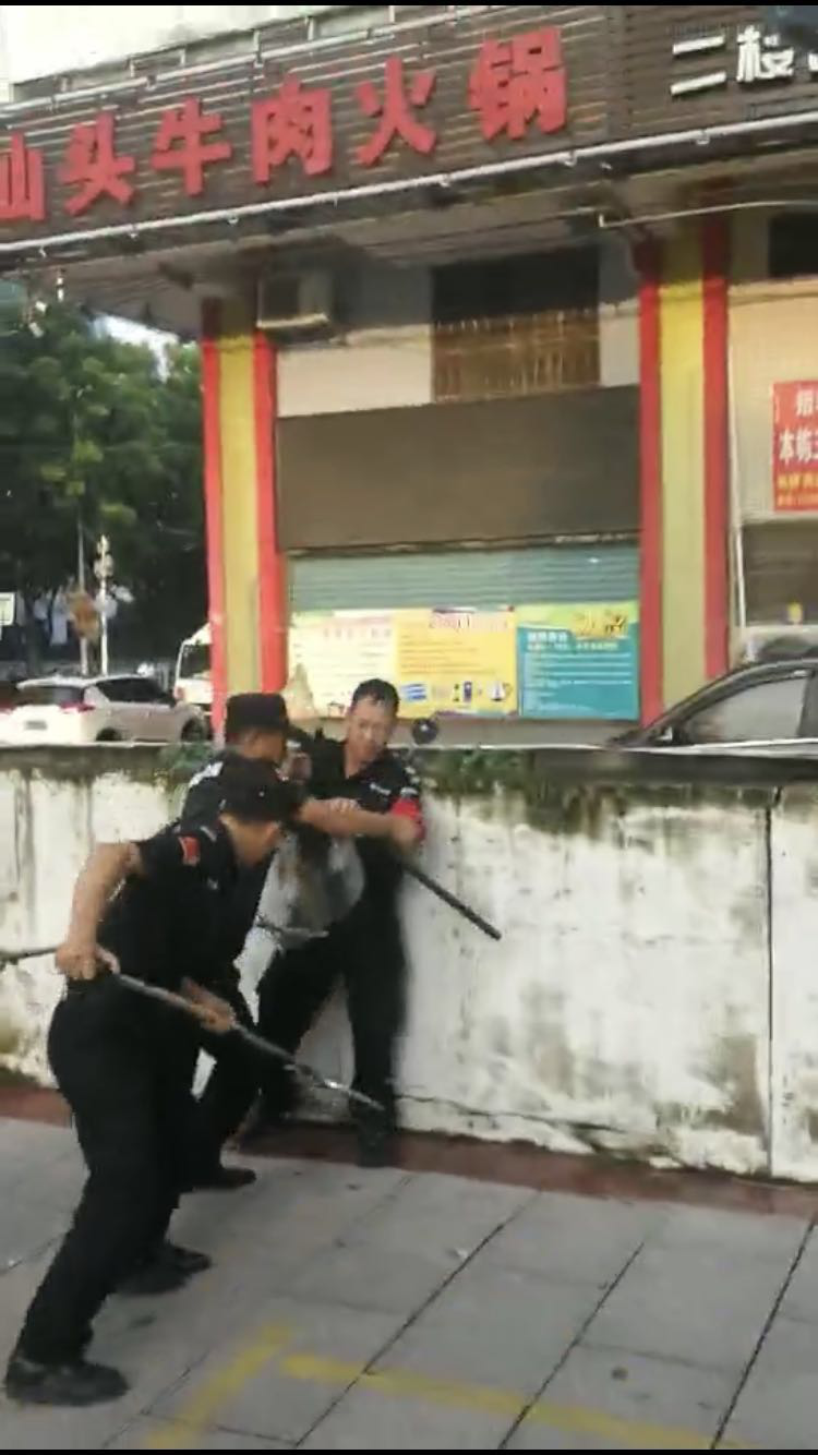 本次实战场景模拟内容为:暴力人员冲进项目点所在超市内,对人员进行伤害,值班保安发现后,及时通知友邻岗位队员,携带防暴器械到达现场,根据平时的操练动作和教授的器械使用方法,分工明确、配合默契很快就把暴力人员逼入墙角制服 。